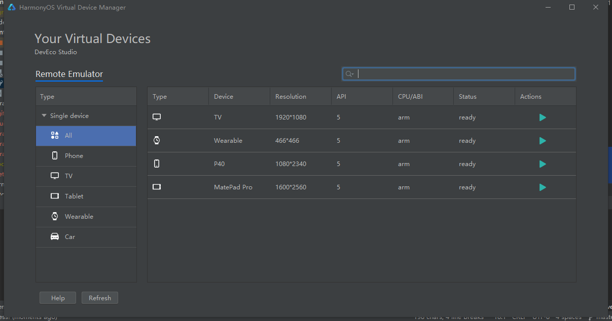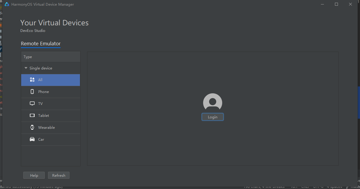 点击开发工具的头部 Tools-> Device Manager 首先会进入模拟器分类界面,需要登录华为开发平台,提前准备好需要的账号。