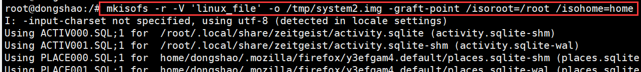 mkisofs -r -V 'linux_file' -o /tmp/system2.img -graft-point /isoroot=/root /isohome=/home