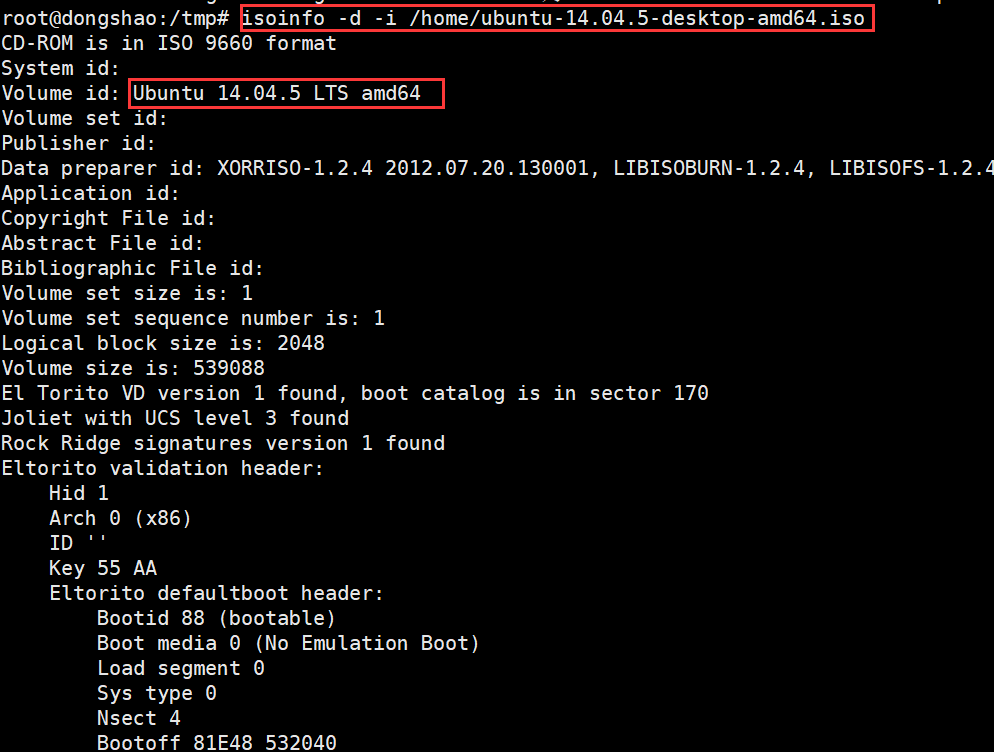 isoinfo -d -i /home/ubuntu-14.04.5-desktop-amd64.iso