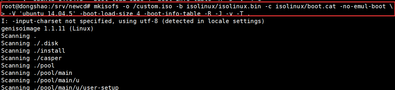 mkisofs -o /custom.iso -b isolinux/isolinux.bin -c isolinux/boot.cat -no-emul-boot -V 'Ubuntu 14.04.5' -boot-load-size 4 -boot-info-table -R -J -v -T .