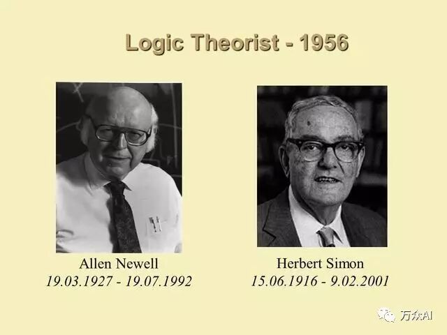 五年后,Allen Newell, Herbert Simon和Cliff Shaw创造了第一个人工智能程序Logic Theorist。这个程序最终可以证明Whitehead和Russell的数学原理中提到的52个原理中的38个, 并且部分证明方法比已有的方法更加优雅。当他们开始设计这个程序的时候,连“人工智能”这个词都还没出现。Simon是一位政治科学家,他在研究官僚作风如何发挥他有限理性的理论研究中已经小有成就,之后他也因此获得了诺贝尔奖。这些研究表面上似乎与人工智能有很大差异,但实际上,和人工智能一样,它需要对人类解决问题和决策的本质有一定的认识。西蒙在20世纪50年代初,看到打印机打印出地图,使用普通字母和标点符号作为符号,这使他意识到可以操纵符号的机器可以模拟决策,甚至可以模拟人类思维的过程。