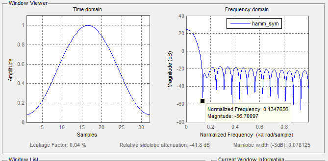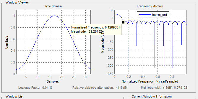 | hamming(symmetric) | 4.3125*谱线间隔 | -41.8dB | 0.04% | 0.9976 | 0.0800 |