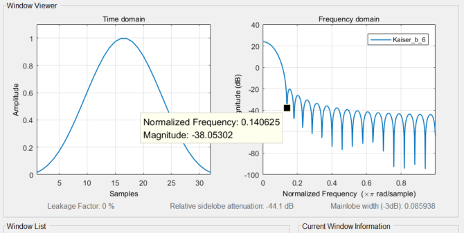 | Kaiser(β=6) | 4.4375*谱线间隔 | -44.1dB | 0% | 0.9998 | 0.0149 |