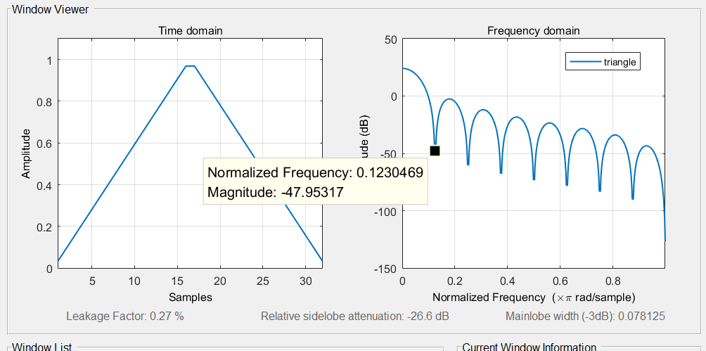 | triang | 3.9375*谱线间隔 | -26.6dB | 0.27% | 0.9688 | 0.0313 |
