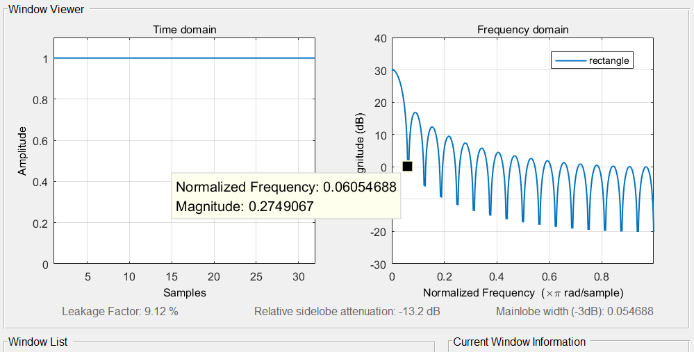 | 窗名称 | 主瓣宽度 | 旁瓣相对衰减(旁瓣抑制) | 旁瓣能量占比 | 最大值(32个点时) | 最小值(32个点时) |