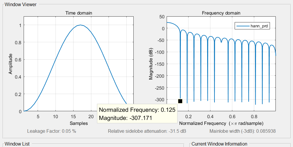 | hann(periodic) | 4*谱线间隔 | -31.5dB | 0.05% | 1 | 0 |