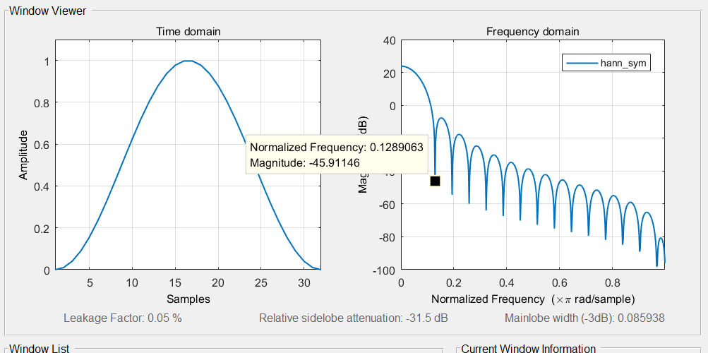 | hann(symmetric) | 4.125*谱线间隔 | -31.5dB | 0.05% | 0.9974 | 0 |