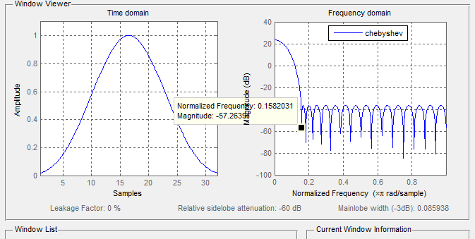 | chebyshev(60dB旁瓣衰减) | 5.0625*谱线间隔 | -60dB(可设置) | 0% | 1 | 0.0189 |