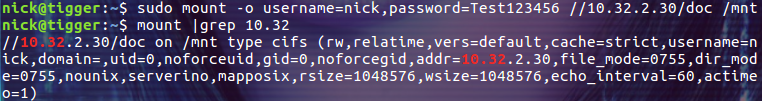 $ sudo mount -t cifs -o username=nick,password=Test123456 //10.32.2.30/doc /mnt