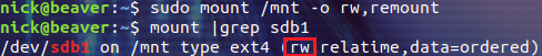 除了根目录,重新挂载其它挂载点也是一样的,比如我们把前面挂载的 sdb1 分区重新挂载为读写模式: