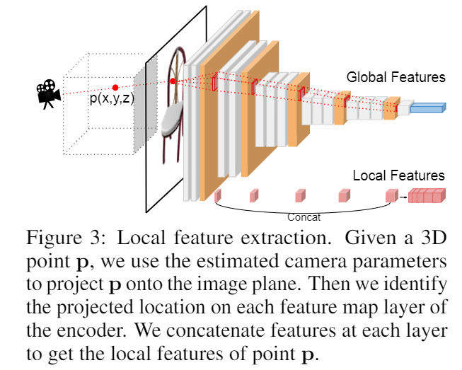 特征提取:仅仅使用全局特征很难捕捉到类似于孔洞,细薄结构等形状细节,因此引入了局部图像特征集中于细粒度的细节重建: