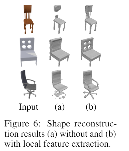 6.使用从二维图像中学习到的形状嵌入可以捕捉到全局形状属性,但是容易忽略孔洞以及细薄结构这样的细节;