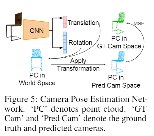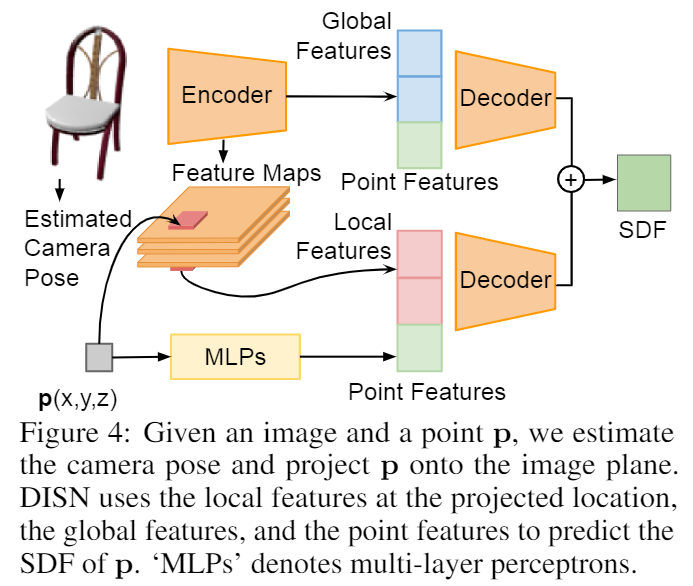 DISN首先估计相机参数将三维世界坐标中的物体映射到二维图像平面的摄影机参数;给定预测得到的相机参数,我们将每一个三维 query 点投影到图像平面上,然后收集对应图像块的多尺度 CNN 特征,然后 DISN 使用多尺度的局部特征和全局特征将给出的三维点解码为 SDF 值。