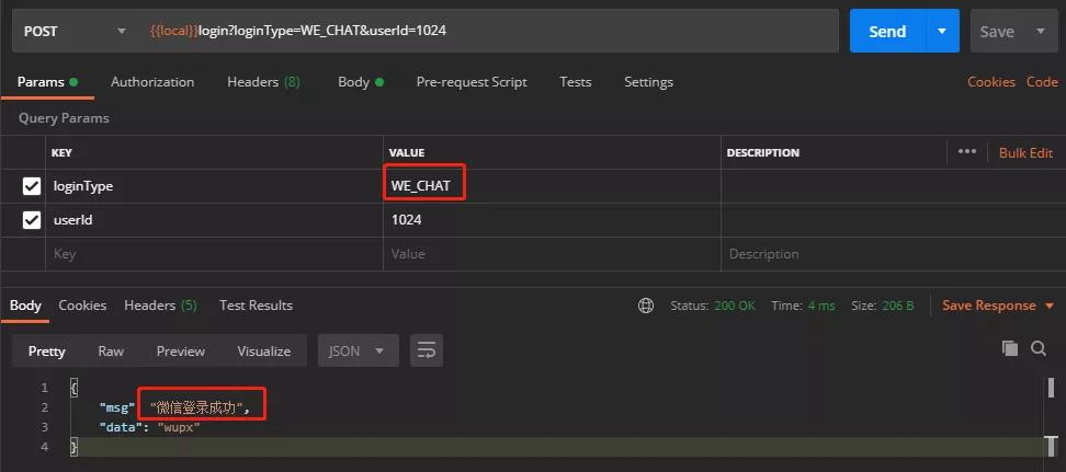 public class WeChatLoginHandler implements LoginHandler<String> {private final Logger logger = LoggerFactory.getLogger(this.getClass());/*** 获取登录类型** @return*/@Overridepublic LoginType getLoginType() {return LoginType.WE_CHAT;}/*** 登录** @param request* @return*/@Overridepublic LoginResponse<String, String> handleLogin(LoginRequest request) {logger.info("微信登录:userId:{}", request.getUserId());String weChatName = getWeChatName(request);return LoginResponse.success("微信登录成功", weChatName);}private String getWeChatName(LoginRequest request) {return "wupx";}