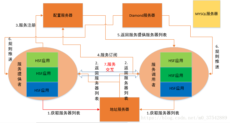 服务:服务是调用方和提供方交流的依凭,一般是一个接口,表示一个业务行为以及相关的数据含义。通过使用HSFApiProviderBean能够暴露一个服务,将机器的地址注册到configserver,并且能够通过12200端口进行服务提供,通过HSFApiConsumerBean能够包装出一个客户端,它是服务接口的一个代理,并且它从configserver上订阅了服务的地址列表,能够在这个列表上完成随机调用,做到负载均衡与HA((High Available,高可用性群集)。