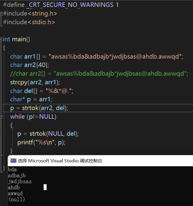 {char arr1[] = "s&a%d&WAEA&HAHA";char arr2[40];//char arr2[] = "awsas%bda&adbajb*jwdjbsas@ahdbawwqd";strcpy(arr2, arr1);char del[] = "%&";char* p = arr1;//for(p = strtok(arr2, del);p!=NULL;p=strtok(NULL,del))//{// printf("%s\n", p);//}for(p = my_strtok(arr2, del);p!=NULL;p=my_strtok(NULL,del)){printf("%s\n", p);}
