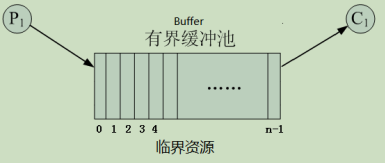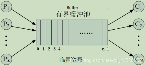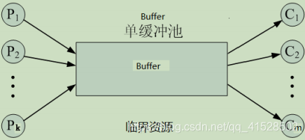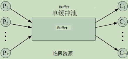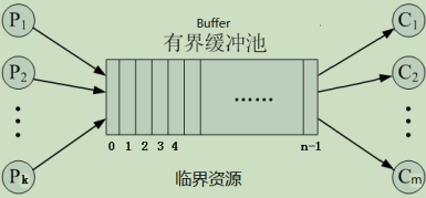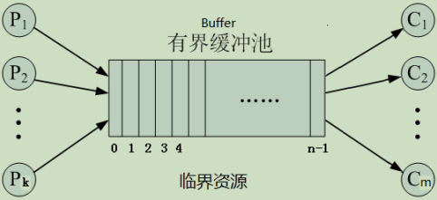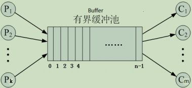 - 多个生产者、多个消费者通过共享含n个缓冲区的缓冲池Buffer协作;