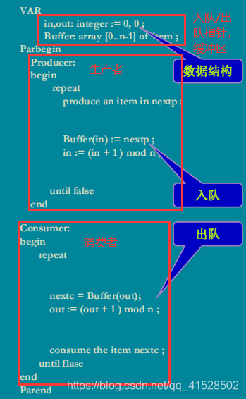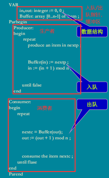 以入队为例,当执行完Buffer(in):=nextp时,时间片耗尽,这时又进来了一个生产者进程,空缓冲区资源足够,于是也到了Buffer(in):=nextp这一步,但由于上一个进程刚给in所指位置赋值,in还没来得及前移,in所指位置就又被新的数据覆盖,从而出现错误。