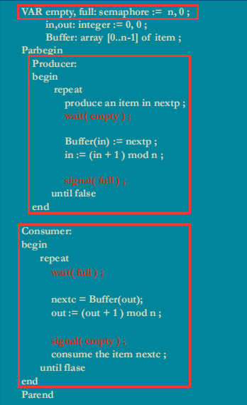 - 共享什么样的资源?:生产者进程共享空缓冲区资源;消费者进程共享满缓冲区资源;