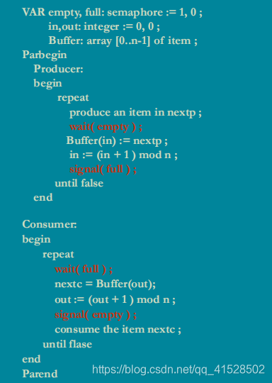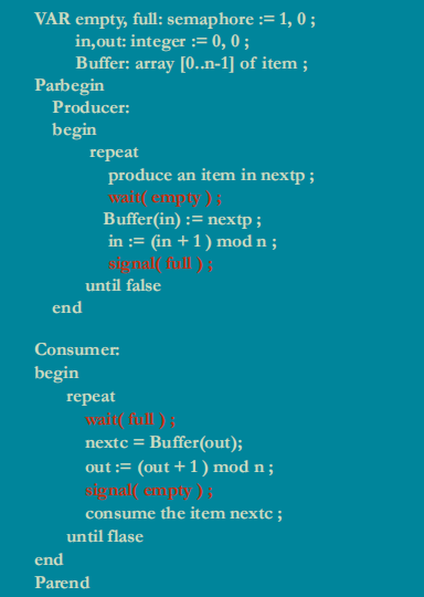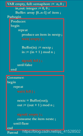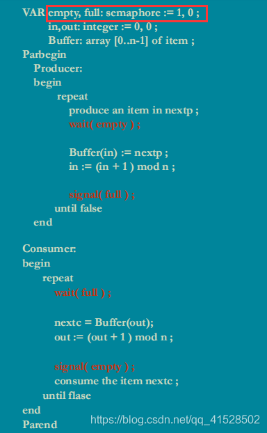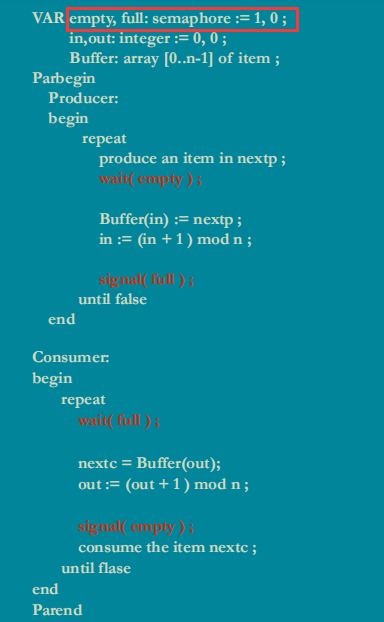 考虑到有两种临界资源:空/满缓冲区资源,故设计两个资源信号量:full、empty,于是:
