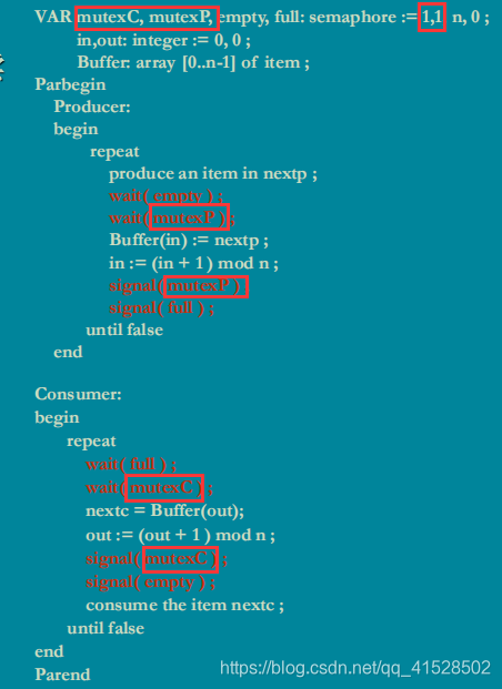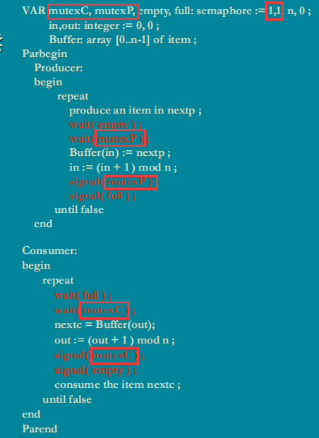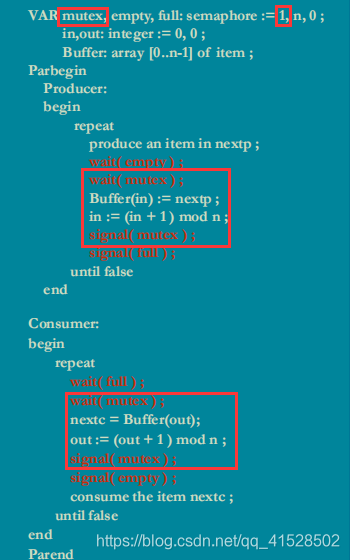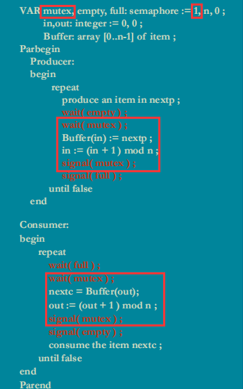 标准程序中,设置了一个mutex,使得任何时候只有一个生产者或是消费者进程执行;