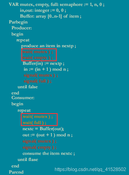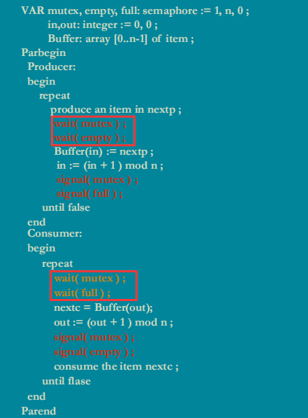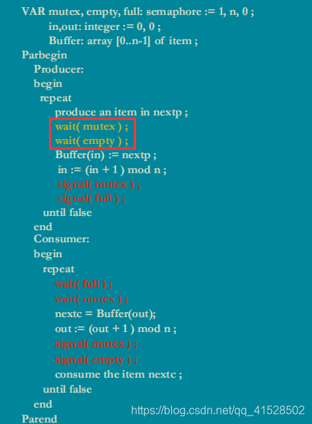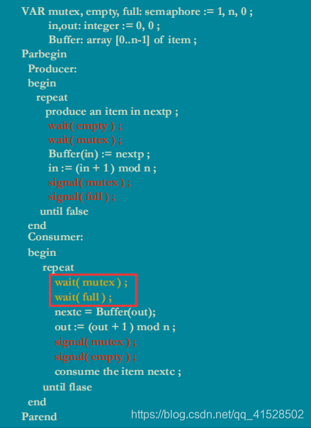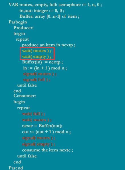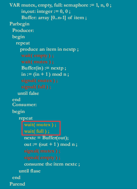 当缓冲池无数据(条件1),empty=n,full=0,又来一个消费者(条件2),在wait(full)后进入阻塞,此时mutex已被阻塞,那么此后不论来生产者/消费者,都将阻塞,产生死锁!