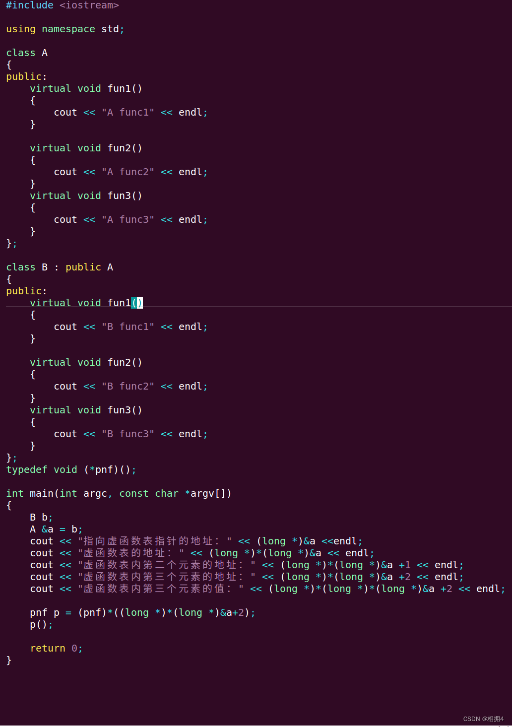 为了将对象与虚函数表关联起来,编译器会在对象中会增加一个指针成员用于存储虚函数表的位置。基类的指针指向派生类对象时就是通过虚函数表的指针来找到实际应该调用的函数。