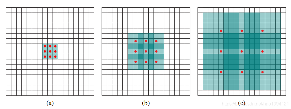 (a)图对应3x3的1-dilated conv,和普通的卷积操作一样,(b)图对应3x3的2-dilated conv,实际的卷积kernel size还是3x3,但是空洞为1,也就是对于一个7x7的图像patch,只有9个红色的点和3x3的kernel发生卷积操作,其余的点略过。也可以理解为kernel的size为7x7,但是只有图中的9个点的权重不为0,其余都为0。 可以看到虽然kernel size只有3x3,但是这个卷积的感受野已经增大到了7x7(如果考虑到这个2-dilated conv的前一层是一个1-dilated conv的话,那么每个红点就是1-dilated的卷积输出,所以感受野为3x3,所以1-dilated和2-dilated合起来就能达到7x7的conv),(c)图是4-dilated conv操作,同理跟在两个1-dilated和2-dilated conv的后面,能达到15x15的感受野。对比传统的conv操作,3层3x3的卷积加起来,stride为1的话,只能达到(kernel-1)*layer+1=7的感受野,也就是和层数layer成线性关系,而dilated conv的感受野是指数级的增长。