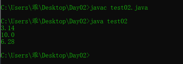 class Test02{public static void main(String[] args){float f=3.14F;System.out.println(f);double d=10;System.out.println(d);double d1=3.14;double d2=3.14;double d3=d1+d2;System.out.println(d3);}