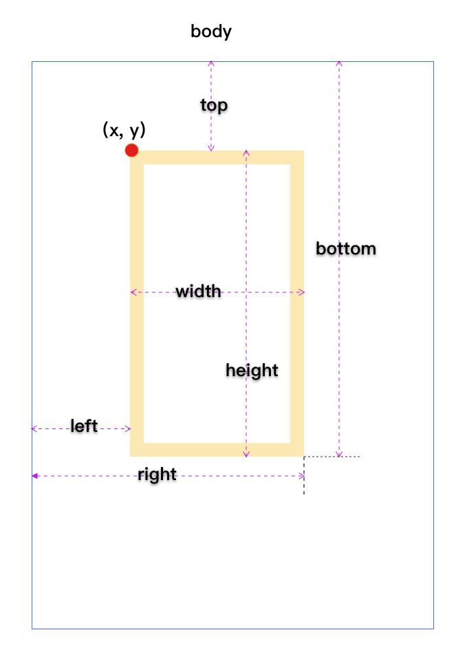 通过这个 API 获取元素相对可视区域的位置,返回值是浮点数。其中,大多数情况下 x 与 left 相等,y 与 top 相等,只有当 width 或 height 为负数的时候会有区别。left = x + with,top = y + height。图中黄色区域为边框。