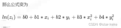 {Eigen::MatrixXd MatX;Eigen::MatrixXd MatY;MatX.resize(number, 5);MatY.resize(number, 1);Eigen::MatrixXd MatLS;MatLS.resize(number, 1);for (int i = 0; i < number; ++i) {Eigen::Matrix<double, 5, 1> row;row << 1 , input[i][0] , input[i][1] , input[i][0] * input[i][0] , input[i][1] * input[i][1];MatX.row(i) = row;MatY.row(i)[0] = log(input[i][2]);}MatLS = (MatX.transpose() * MatX).inverse() * MatX.transpose() * MatY;A = MatLS(0, 0);B = MatLS(1, 0);C = MatLS(2, 0);D = MatLS(3, 0);E = MatLS(4, 0);