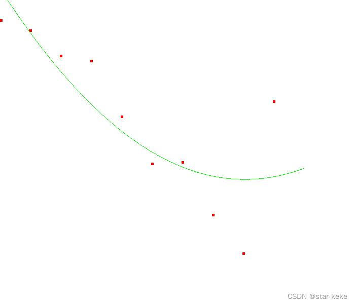 void least_square_curve(double input[][2], int number, int jie, std::vector<double>&weight){Eigen::MatrixXd MatX;Eigen::MatrixXd MatY;MatX.resize(number, jie);MatY.resize(number, 1);Eigen::MatrixXd MatLS;MatLS.resize(number, 1);for(int i = 0; i < number; ++i){std::vector<double> pows;for(int j = 0; j < jie; j++){double p = pow(input[i][0], j);MatX(i, j) = p;}MatY.row(i)[0] = input[i][1];}MatLS = (MatX.transpose()*MatX).inverse()*MatX.transpose()*MatY;for(int i = 0; i < jie; i++)weight.push_back(MatLS(i, 0)) ;