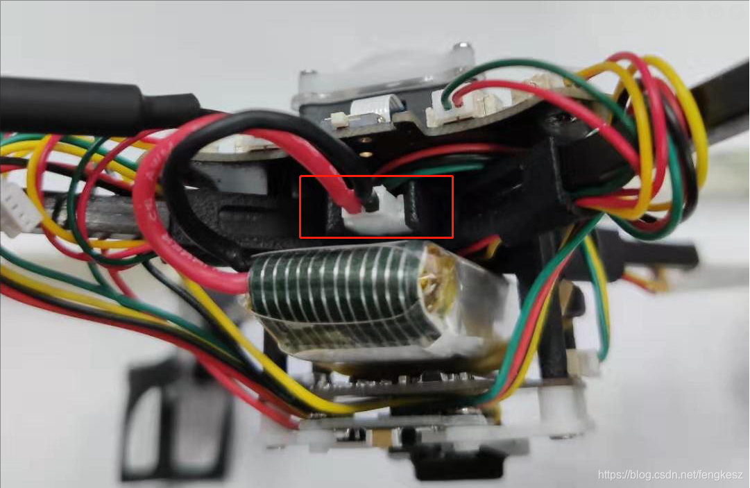 4)把接上电池后的无人机平放在地面上,打开电源开关,电源开关在无人机的2.4G天线处,如下图所示。