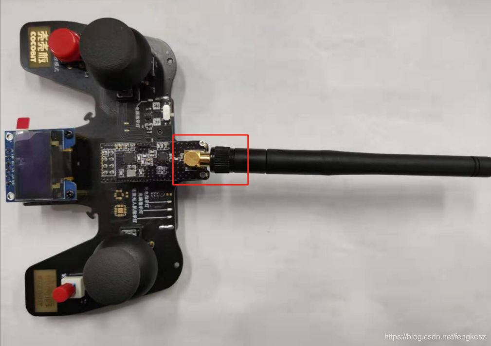 2)取出遥控手柄及2.4G天线,将2.4G天线旋转扭进到遥控手柄的天线接口端,如下图所示。