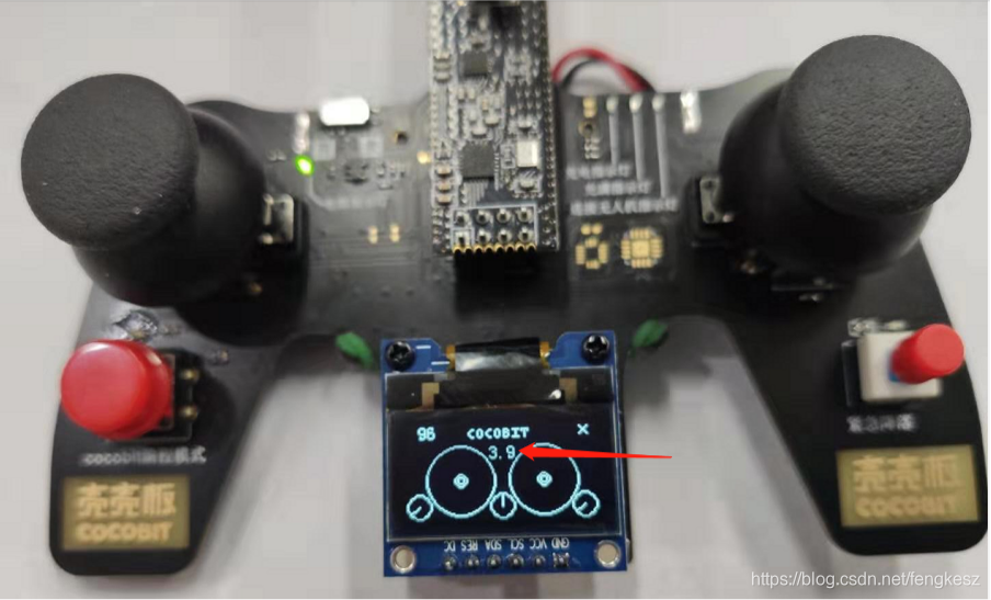 开机后,在OLED的正中间会有手柄的电压值显示(连接上无人机后显示的电压值变为无人机的),如下图所示。