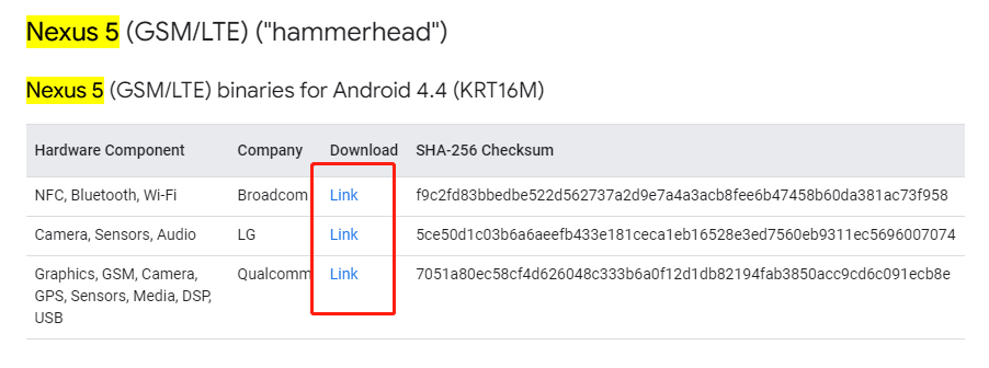 版本号与驱动匹配表:https://developers.google.com/android/drivers#hammerheadmra58k
