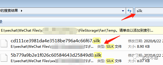 里面搜索silk可以找到所有语音文件,当然如果语音文件多会很慢,可以使用之前分享的工具wox 如何快速搜索文件和文件内容