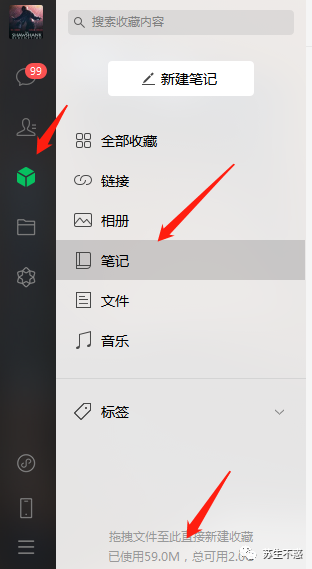 打开电脑端微信收藏,里面有链接,相册,笔记,文件和音乐,为了防止微信里的文件经常失效可以保存到收藏里,不过限制总容量为2g 。