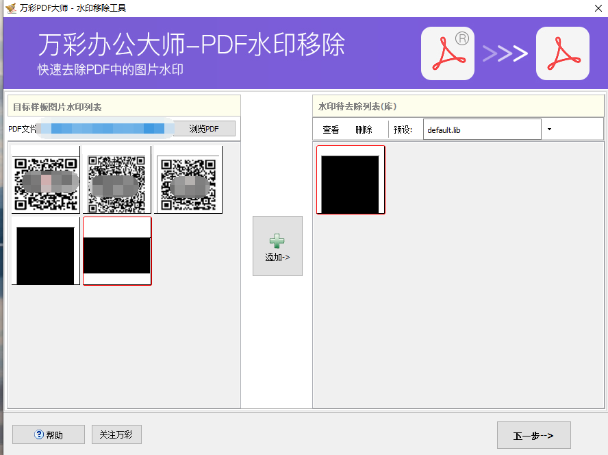 1.选择一个PDF,并将想要删除的水印添加到水印待去除列表
