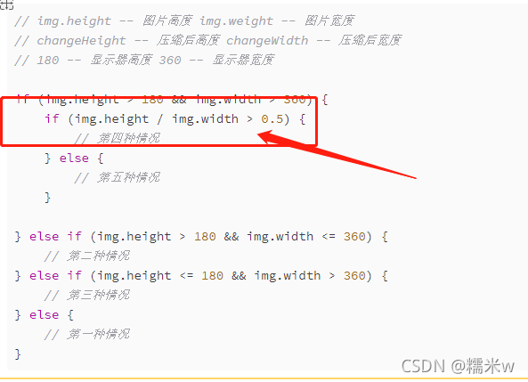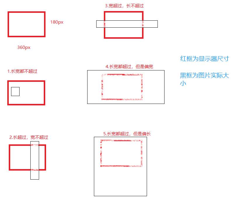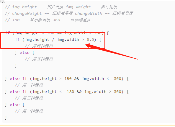 // 180 -- 显示器高度 360 -- 显示器宽度if (img.height > 180 && img.width > 360) {if (img.height / img.width > 0.5) {// 第四种情况} else {// 第五种情况}} else if (img.height > 180 && img.width <= 360) {// 第二种情况