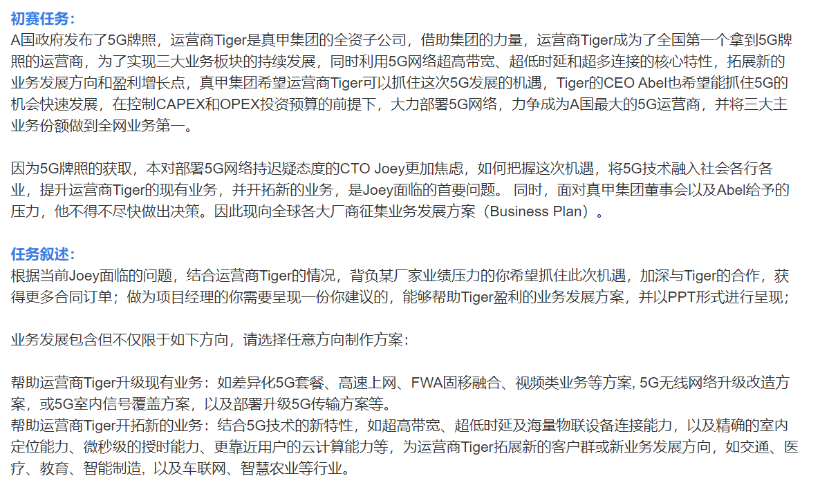 奥格的定位是产品经理,主要是负责项目前期和客户的技术交流,了解、挖掘客户项目的需求,提供相应的解决方案,做出技术交流宣讲。因此需要一些技术基础,初赛提供的题目也就是和5G相关的行业技术方案,具体任务如下图,任务的提交形式是PPT,也需要提交一个自己的简历(这里也附上自己的初赛作品,供有需要的同学参考一下。百度网盘链接:https://pan.baidu.com/s/1e2Szzga85bzIpuTJxC2APA