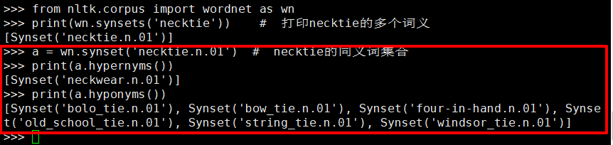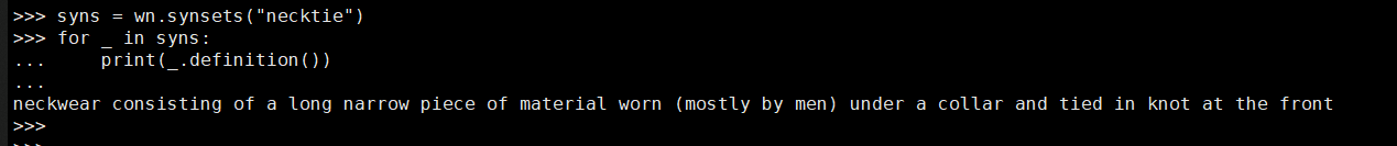 print(wn.synsets('necktie')) # 打印necktie的多个词义