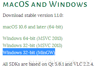 我使用的是Windows 32-bit(MinGW)版本的VLC-Qt库,可以去官网下载。