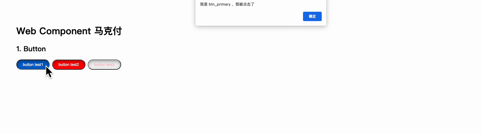 <html lang="en"><head><meta charset="UTF-8" /><meta name="viewport" content="width=device-width, initial-scale=1.0" /><title>Web Component</title></head><body style="padding: 60px"><h1>Web Component 马克付</h1><h2>1. Button</h2><mark-button type="primary"><span slot="btn-content" id="btn_primary">button test1</span></mark-button><mark-button type="warning"><span slot="btn-content" id="btn_danger">button test2</span></mark-button><mark-button type="default"><span slot="btn-content">button test3</span></mark-button><!-- template定义区 --><template id="btn_tpl"><slot name="btn-content">button content xxx</slot></template><script src="components/button.js"></script><script> document.querySelector('#btn_primary').addEventListener('click',() => {alert('我是 btn_primary ,我被点击了')},false)document.querySelector('#btn_danger').addEventListener('click',() => {alert('我是 btn_danger 我很危险')},false) </script></body>