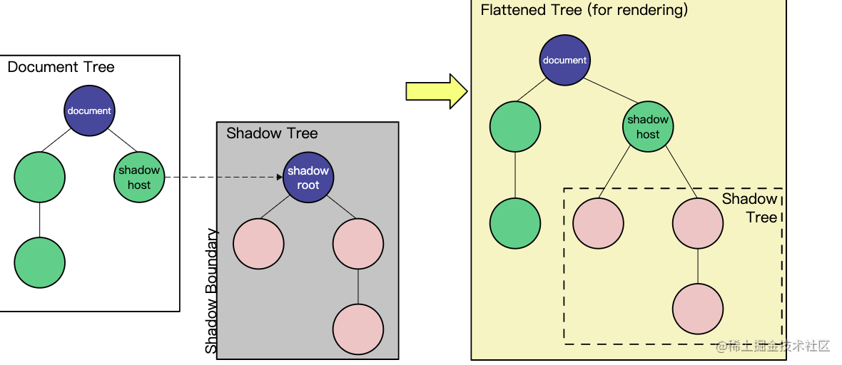 Shadow DOM 可将隐藏的 DOM挂到一个元素上:且 shadow root 节点为起始根节点,在这个根节点的下方,可以是任意元素,和普通的 DOM 元素一样