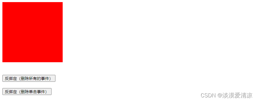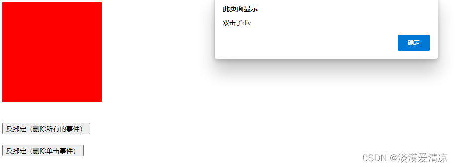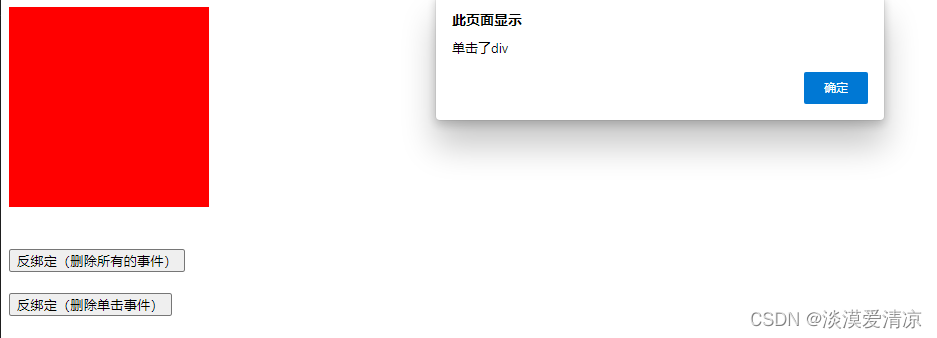 <body><div></div><br><br><button id="btn_all">反绑定(删除所有的事件)</button><br><br><button id="btn_one">反绑定(删除单击事件)</button><script src="../jquery-3.4.1.js"></script><script>$(function(){$('div').bind('click',function(){ //单击事件alert('单击了div');});$('div').bind('dblclick',function(){ //双击事件alert('双击了div');});$('#btn_all').click(function(){ //删除所有绑定的事件$('div').unbind();})$('#btn_one').click(function(){ //删除指定的事件(单击事件)$('div').unbind('click');})})</script>