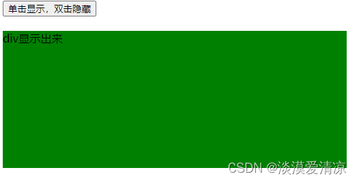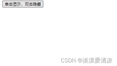 <body><button id="btn">单击显示,双击隐藏</button><br><br><div> </div><script src="../jquery-3.4.1.js"></script><script>$(function () {$('#btn').click(function () { //单击事件$('div').css('display', 'block');$('div').html('div显示出来');})$('#btn').dblclick(function () { //双击事件$('div').css('display', 'none');})});</script>