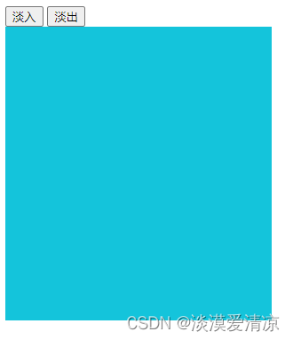 <body><button id="btn_fadein">淡入</button><button id="btn_fadeout">淡出</button><div> </div><script src="../jquery-3.4.1.js"></script><script>$(function(){$('#btn_fadein').click(function(){$('div').fadeIn(2000);});$('#btn_fadeout').click(function(){$('div').fadeOut(2000);});})</script>
