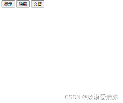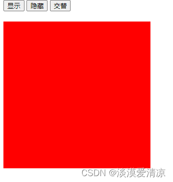 </style><body><button id="btn_show">显示</button><button id="btn_hide">隐藏</button><button id="btn_toggle">交替</button><br><br><div></div><script src="../jquery-3.4.1.js"></script><script>$(function () {$('#btn_show').click(function () {// $('div').show(2000)$('div').show('slow');});$('#btn_hide').click(function () {$('div').hide(1000);});$('#btn_toggle').click(function () {$('div').toggle(1000);});})</script>