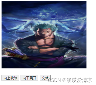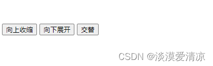 <body><img src="./1.jpg" alt="" width="330" height="260"><br><br><button id="btn_up">向上收缩</button><button id="btn_down">向下展开</button><button id="btn_toggle">交替</button><script src="../jquery-3.4.1.js"></script><script>$(function () {$('#btn_up').click(function () {$('img').slideUp(2000);});$('#btn_down').click(function () {$('img').slideDown(2000);});$('#btn_toggle').click(function () {$('img').slideToggle(2000);});})</script>
